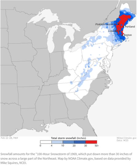In terms of impactful snowstorms across New England, the most impactful was actually a storm that lasted 100 hours in 1969. On the Northeast Snowfall Impact Scale, a measure developed by Paul Kocin and Louis Uccellini of the National Weather Service which runs from 1 to 5, the 1969 storm was a 4 for the northeast corridor, but a 5 here in New England.